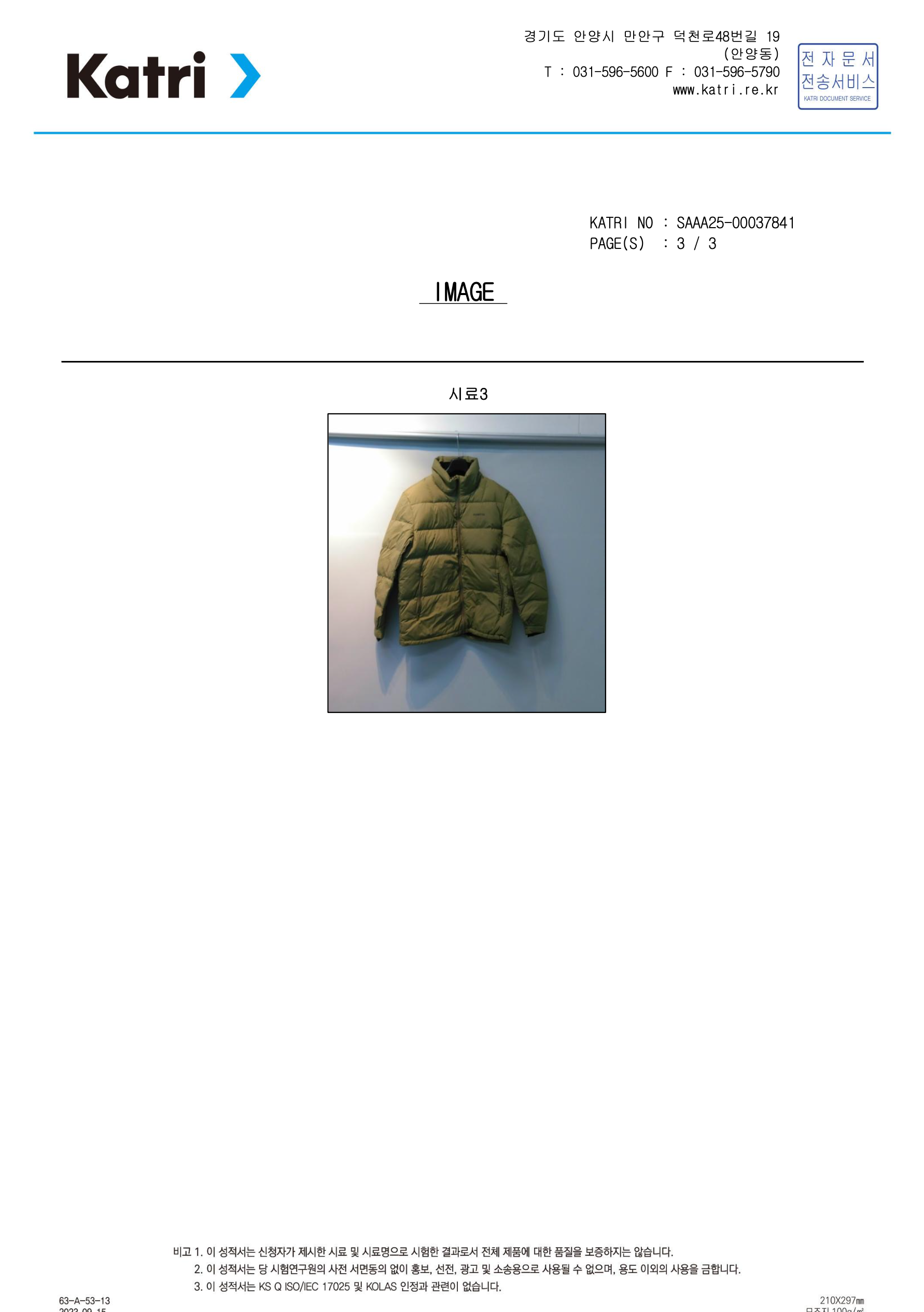 • Duck Down (85%) filling test report issued by KATRI (Korea Apparel Testing & Research Institute)