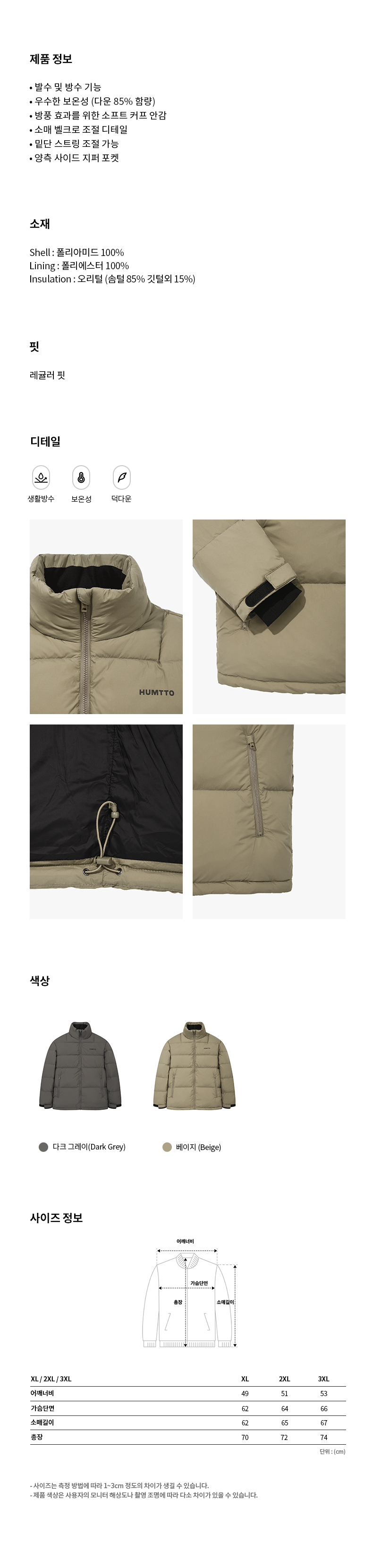 • Filling 1: DUCK DOWN 85%, FEATHER 15% (Body)